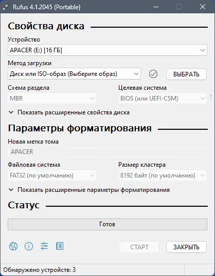 Запуск утилиты не требует установки — достаточно открыть исполняемый файл. После подключения USB-устройства оно автоматически определяется в интерфейсе программы. Пользователь выбирает образ ISO, файловую систему, схему разметки (MBR или GPT) и при необходимости активирует дополнительные опции, такие как выравнивание разделов для старых BIOS. Начало процесса происходит после нажатия кнопки «Start», после чего Rufus выполняет форматирование и копирование данных с отображением прогресса и оценки времени.