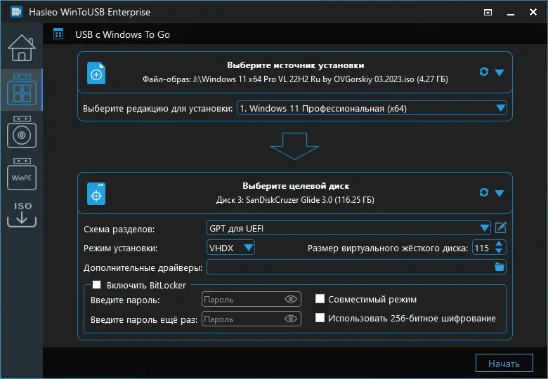 Использование WinToUSB не требует глубоких технических знаний. После запуска необходимо выбрать источник установки — файл образа или физический диск. Далее указывается целевой USB-накопитель и раздел, на который будет произведена установка. Программа автоматически выполнит разметку, скопирует системные файлы и настроит загрузку. Процесс занимает несколько минут, после чего устройство можно использовать на любом совместимом компьютере. Для шифрования можно активировать BitLocker в процессе или после установки.