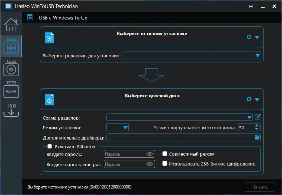 Использование программы начинается с выбора источника установки — образа ISO или физического диска. Далее необходимо указать целевой USB-накопитель и раздел, на который будет установлена система. Программа автоматически подготовит диск, разметит его и начнёт копирование файлов. Поддержка Windows To Go позволяет создавать сертифицированные и несертифицированные накопители, в зависимости от оборудования. После завершения установки устройство можно использовать на любом компьютере, поддерживающем загрузку с USB. Для повышения безопасности можно включить шифрование BitLocker. Также доступна возможность клонирования уже установленной системы на флешку.