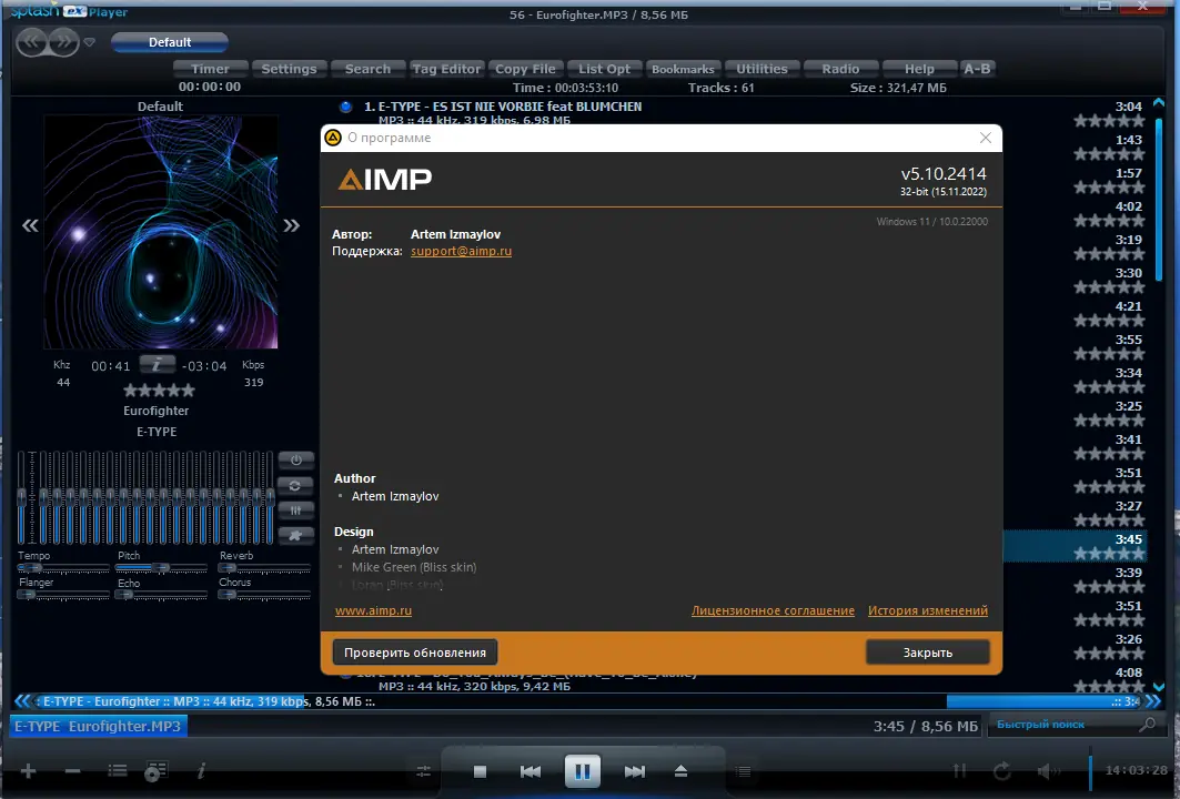 AIMP — это мощный аудиоплеер с расширенными возможностями, включающий в себя модули для конвертации, редактирования тегов, записи дисков и управления музыкальной библиотекой. Поддерживает более 80 аудиоформатов без необходимости установки сторонних кодеков. Программа совместима с системами для windows и предлагает высококачественное воспроизведение благодаря 32-битной обработке звука и поддержке ASIO, WASAPI и DirectSound.