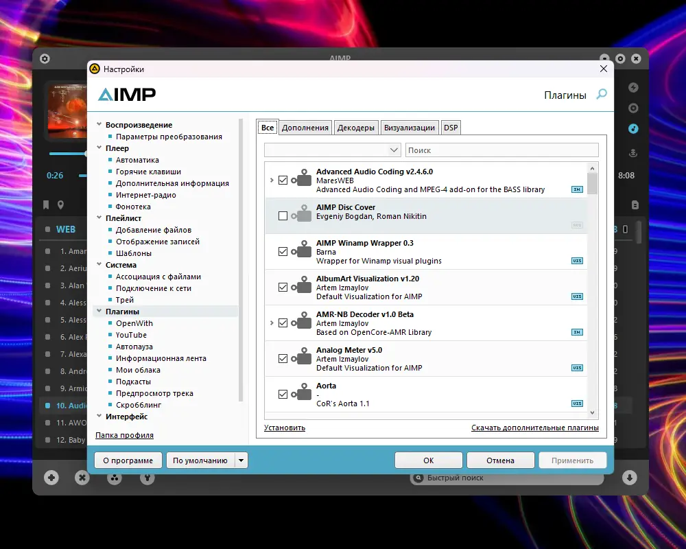 - Расширяемость за счёт поддержки плагинов и сторонних DSP-модулей, включая визуализации и улучшения звучания.