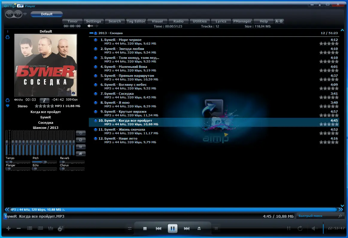 Использование AIMP начинается с импорта музыки в библиотеку или открытия файлов через плейлист. Интерфейс разделён на логические блоки: панель управления, область треков, вкладки фонотеки и визуализации. Для настройки звука доступен 18-полосный эквалайзер с предустановленными профилями и возможность включения эффектов вроде реверберации, хоруса и фланжера. Работа с тегами осуществляется через встроенный редактор, позволяющий изменять метаданные группой, автоматически заполнять поля по шаблону или транслитерировать названия. Аудиоконвертер поддерживает пакетное кодирование с выбором профиля и формата, включая возможность создания одного файла из нескольких с CUE-таблицей.