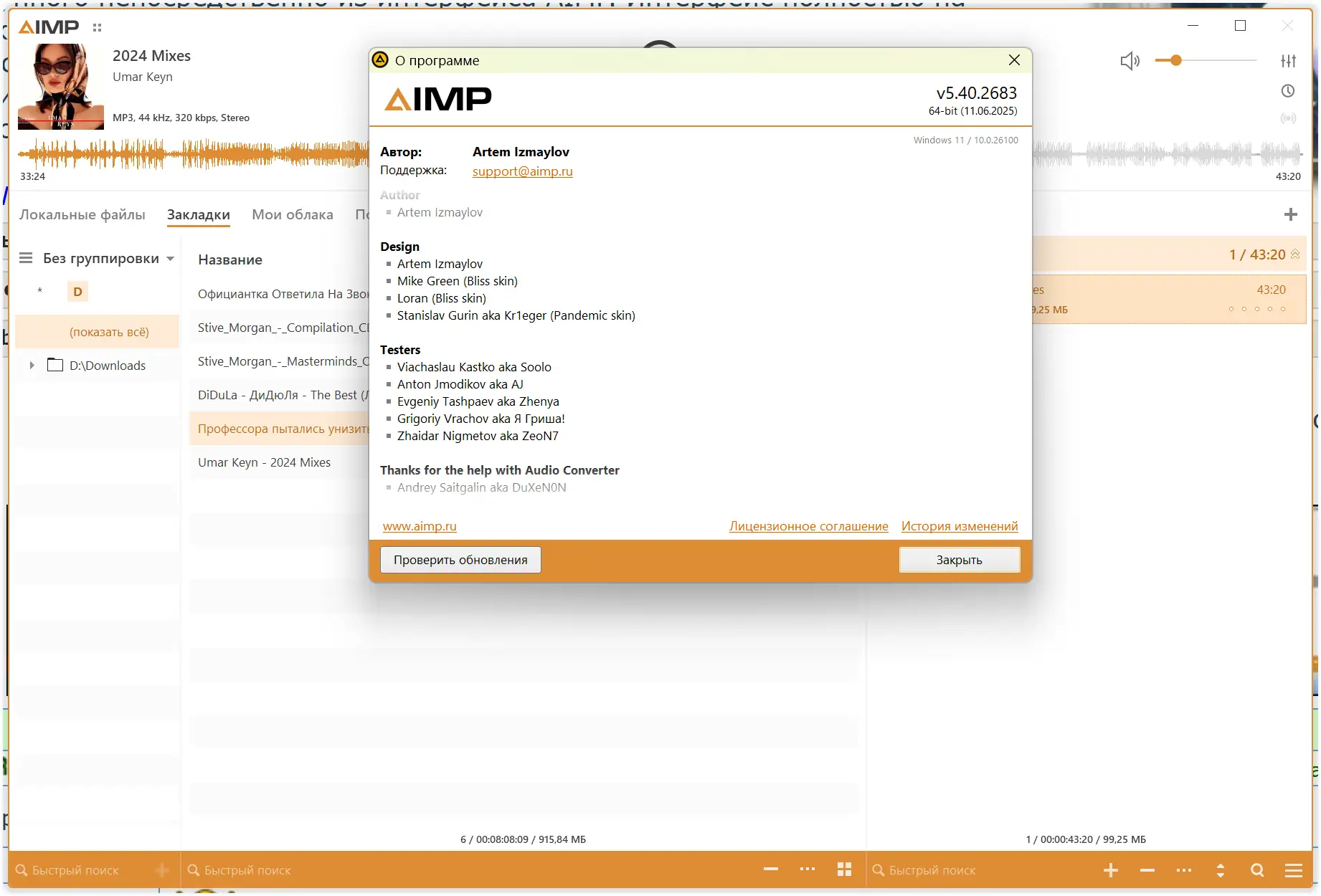 AIMP — это легковесный, мощный и полностью бесплатный аудиоплеер для Windows, способный воспроизводить широкий спектр аудиоформатов с высокой точностью и минимальным потреблением системных ресурсов. Программа предлагает 32-битную обработку звука, поддержку ASIO и WASAPI, встроенный эквалайзер, визуализации и расширяемый функционал через плагины. Интерфейс плеера интуитивно понятен, адаптирован под высокие разрешения экрана и полностью локализован на русский язык.