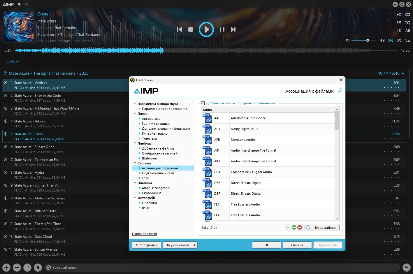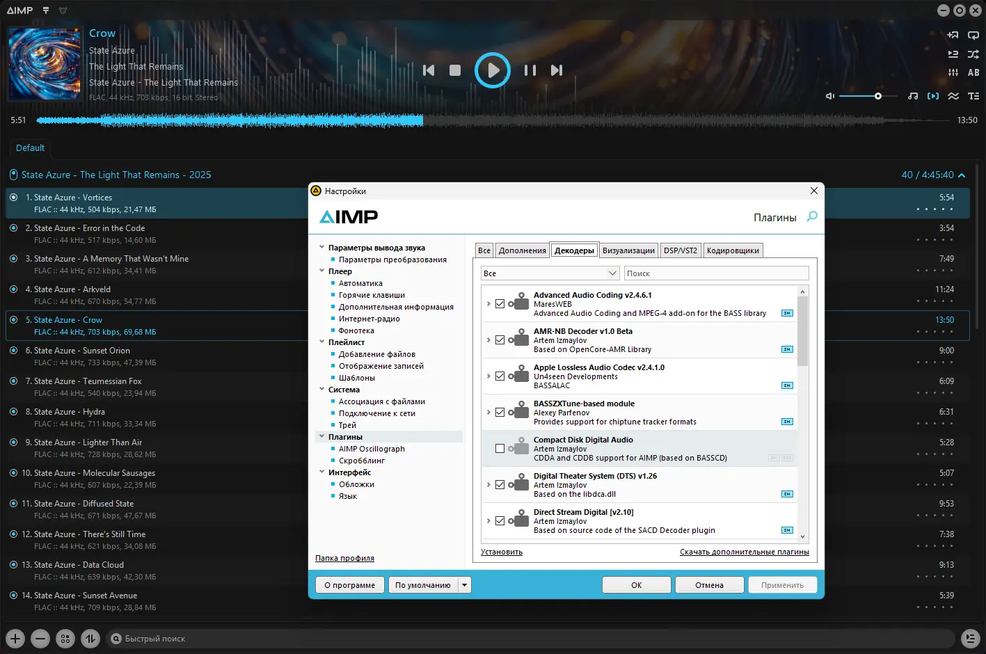 AIMP — это универсальный проигрыватель, объединяющий в себе функции аудиоплеера, конвертера, редактора тегов, CD-риппера и записывающего устройства. Он поддерживает огромное количество аудиоформатов, включая редкие и высококачественные, такие как FLAC, DSD, WavPack и Opus, не требуя установки дополнительных кодеков. Благодаря модульной архитектуре, пользователь может расширять функционал с помощью плагинов и сторонних утилит.