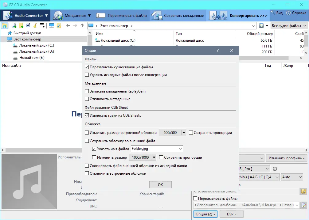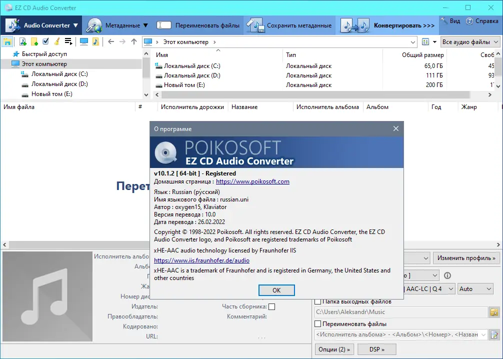 EZ CD Audio Converter — мощный инструмент для высококачественного извлечения аудио с компакт-дисков и конвертации между широким спектром форматов, включая MP3, FLAC, WAV, AAC, Ogg Vorbis и другие. Программа поддерживает работу с защищёнными и повреждёнными дисками, обеспечивает точное копирование, редактирование метаданных и нормализацию громкости. Её интерфейс адаптирован под высокие разрешения, а производительность оптимизирована с использованием современных процессорных инструкций. Утилита совместима с системами Windows и доступна с русским языком интерфейса.