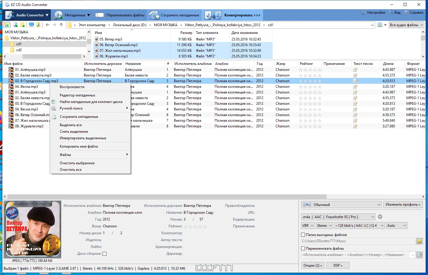 Использование приложения интуитивно понятно: после запуска пользователь выбирает нужный режим — копирование диска, конвертация файлов или запись CD. Для извлечения аудио с компакт-диска система автоматически определяет содержимое, подключается к базе данных и заполняет метаданные. При конвертации доступны детальные настройки: выбор кодека, битрейта, частоты дискретизации, количества каналов и формата выходного файла. Поддержка drag-and-drop упрощает добавление файлов, а возможность пакетной обработки экономит время при работе с большими коллекциями. Также можно создавать .cue-файлы и списки воспроизведения в формате .m3u, что удобно для организации музыкальных архивов.