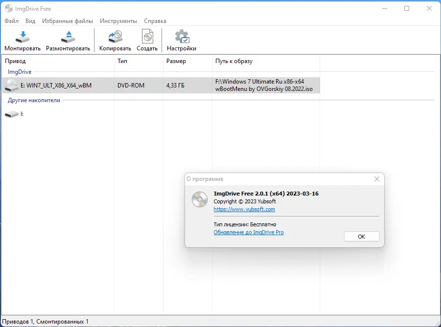 ImgDrive — это компактный и удобный эмулятор виртуальных дисководов, предназначенный для быстрого монтирования образов различных форматов без необходимости использования физических носителей. Программа работает в фоне, интегрируется в контекстное меню Windows и поддерживает до четырёх виртуальных приводов одновременно, обеспечивая высокую функциональность при минимальных системных требованиях.