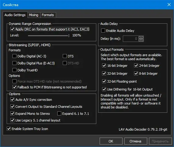 - В состав входят современные аудиокодеки, такие как AAC, AC3, DTS, FLAC и их вариации.