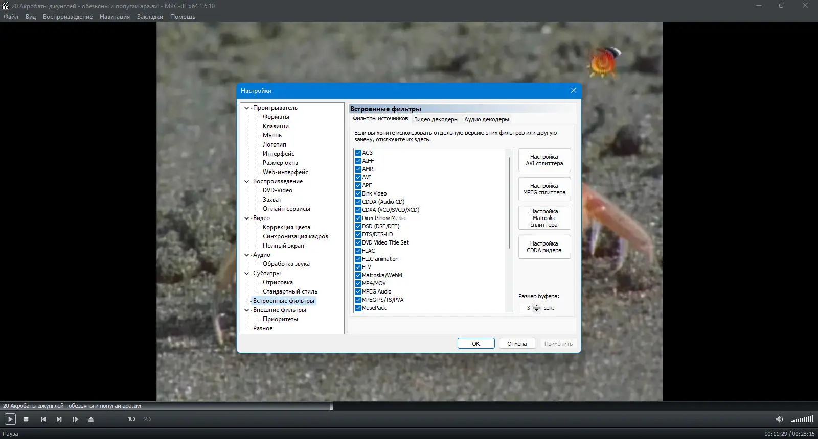 - Встроенные фильтры для декодирования форматов DivX, XviD, H.264 и других через DirectShow