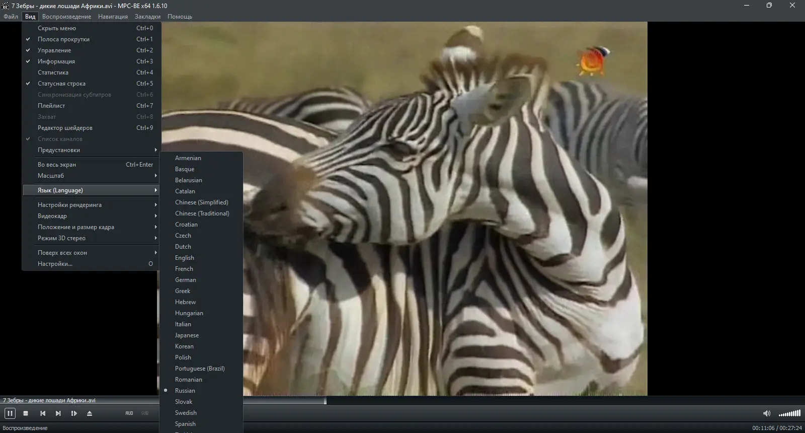 - Поддержка субтитров в форматах SRT, ASS, SSA, WebVTT и других