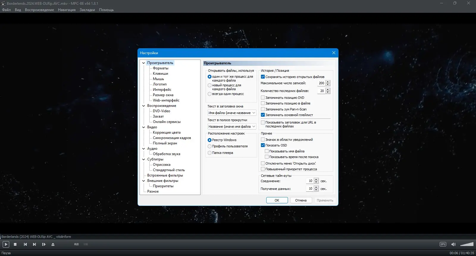 Использование Media Player Classic — Black Edition не требует специальных знаний. После запуска достаточно перетащить нужный медиафайл в окно проигрывателя или открыть его через меню «Файл». Все основные функции доступны через контекстное меню или горячие клавиши, которые можно настроить в параметрах. Поддержка субтитров реализована на высоком уровне — плеер автоматически загружает файлы с тем же именем, а также позволяет регулировать задержку, шрифт и позицию текста. Для просмотра контента на втором мониторе предусмотрен полноценный режим home cinema с возможностью вывода изображения на внешний экран.