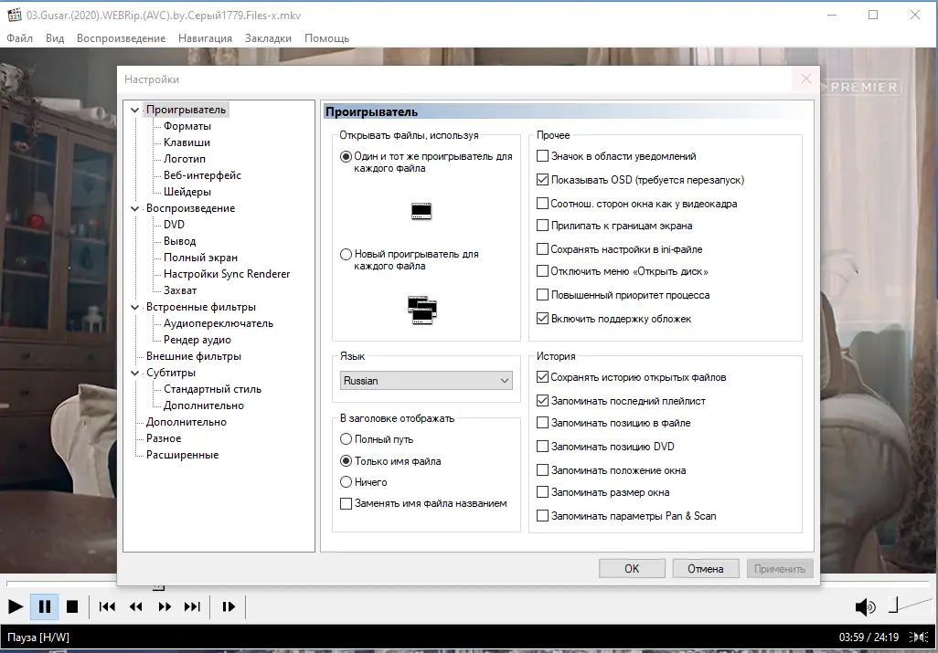 - Гибкая настройка интерфейса, горячих клавиш и поведения плеера в зависимости от контента.