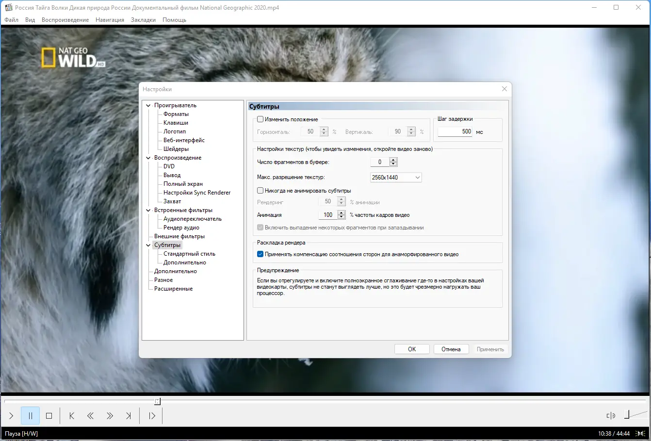 - Гибкая настройка отображения субтитров, включая форматы ASS, SRT, SSA и WebVTT