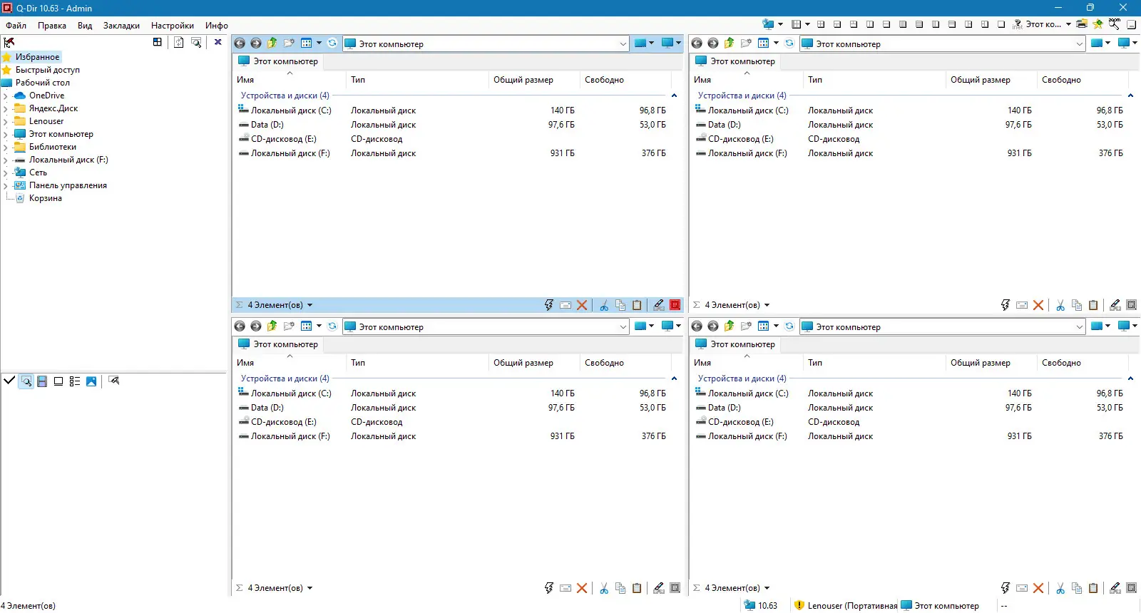 Четырёхпанельный интерфейс делает навигацию по файловой системе максимально удобной и интуитивно понятной