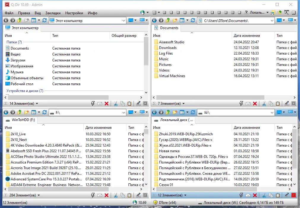 Четырёхпанельный интерфейс Q-Dir делает управление файлами максимально эффективным, особенно при одновременной работе с несколькими каталогами.