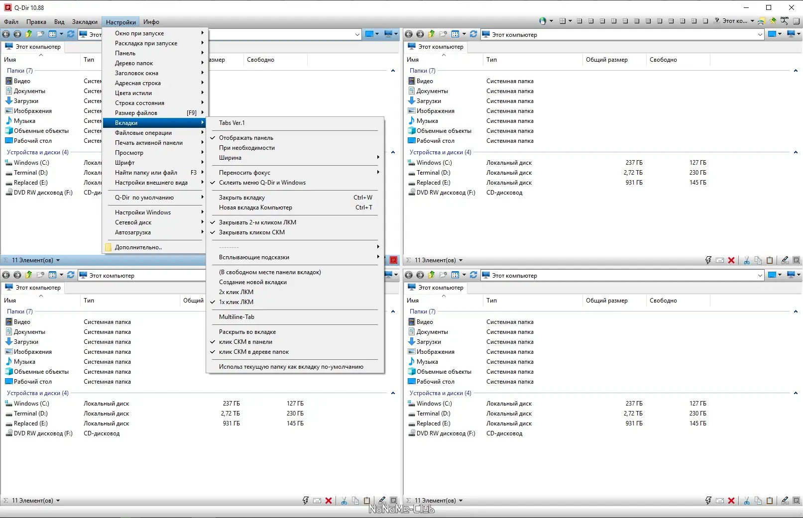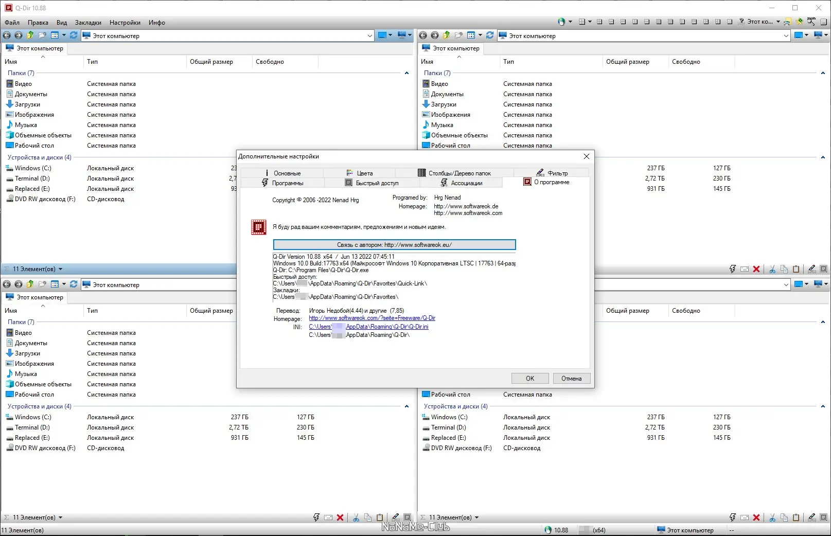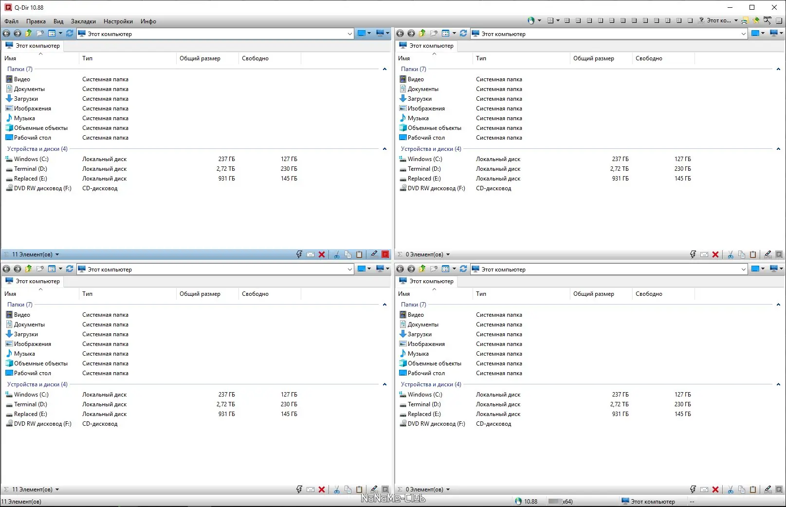 Q-Dir — это компактный и функциональный файловый менеджер, разработанный для пользователей, ценящих скорость и удобство управления файловой системой. Программа использует уникальный четырёхпанельный интерфейс, позволяя одновременно просматривать содержимое нескольких каталогов. Это особенно полезно при копировании, перемещении или сравнении файлов между разными дисками или папками. Интерфейс легко настраивается под нужды пользователя: можно переключаться между одним, двумя или четырьмя окнами, использовать вкладки и задавать цветовую маркировку для разных типов файлов.