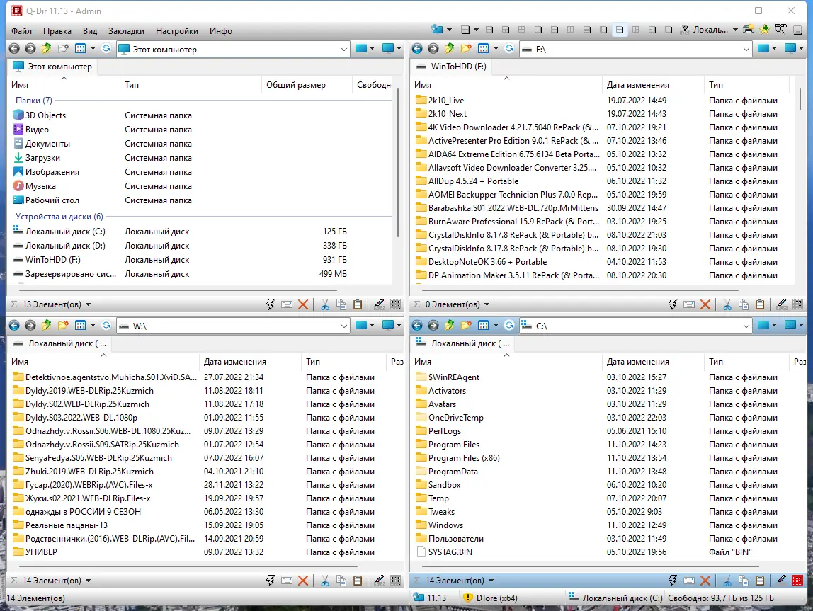 Q-Dir — это компактный и функциональный файловый менеджер с четырёхпанельным интерфейсом, обеспечивающий удобную навигацию по дискам и папкам. Программа поддерживает работу с архивами, сетевыми ресурсами и USB-устройствами, сочетая скорость, гибкость и портативность.