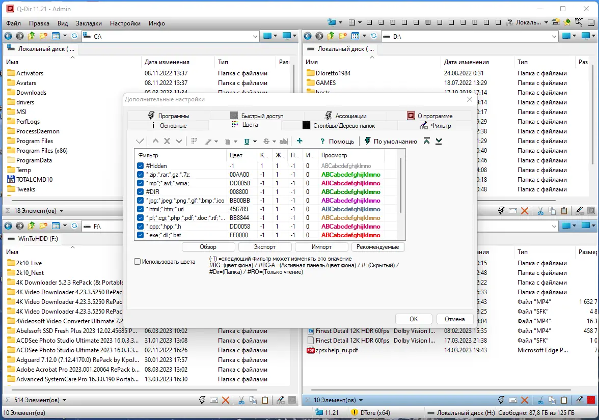 Q-Dir — это многофункциональный файловый менеджер с уникальным четырёхпанельным интерфейсом, обеспечивающий быстрый и удобный доступ к файлам и папкам на локальных, сетевых и съёмных носителях. Программа поддерживает работу с архивами, FTP-серверами, имеет режим предварительного просмотра, экспорт данных и высокую степень настройки под нужды пользователя.