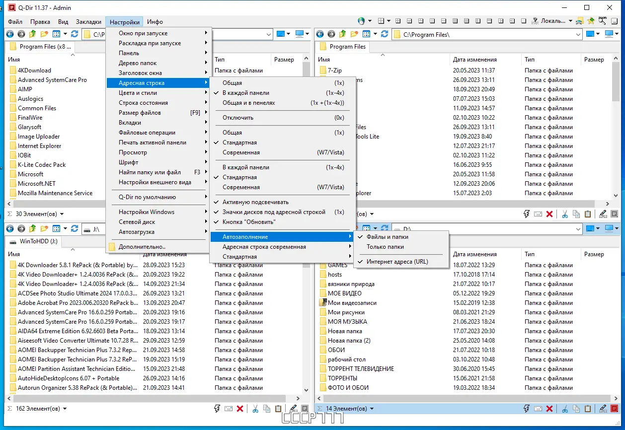 Q-Dir — это файловый менеджер с уникальным четырёхпанельным интерфейсом, обеспечивающий удобную работу с файлами и папками на локальных и внешних носителях. Программа поддерживает различные типы хранилищ, включая ZIP-архивы, FTP-соединения и сетевые директории. Её портативная версия позволяет запускать приложение без установки, что особенно удобно при использовании с флеш-накопителей.