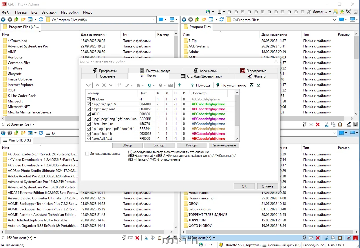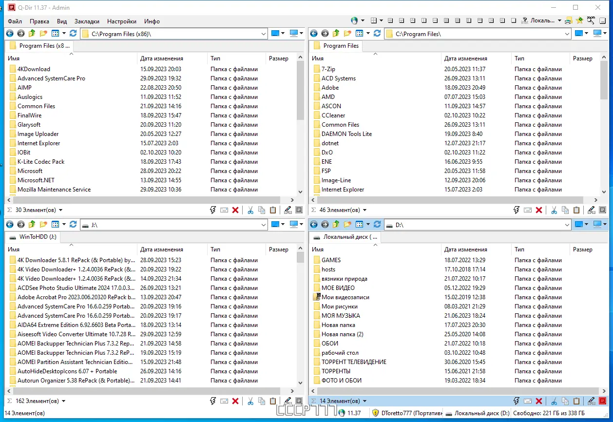 Q-Dir представляет собой мощный инструмент для управления файловой системой, ориентированный на повышение эффективности работы с данными. Его ключевой особенностью является четырёхпанельный интерфейс, позволяющий одновременно просматривать содержимое нескольких каталогов. Это особенно полезно при частом копировании, перемещении или сравнении файлов между разными дисками или папками.