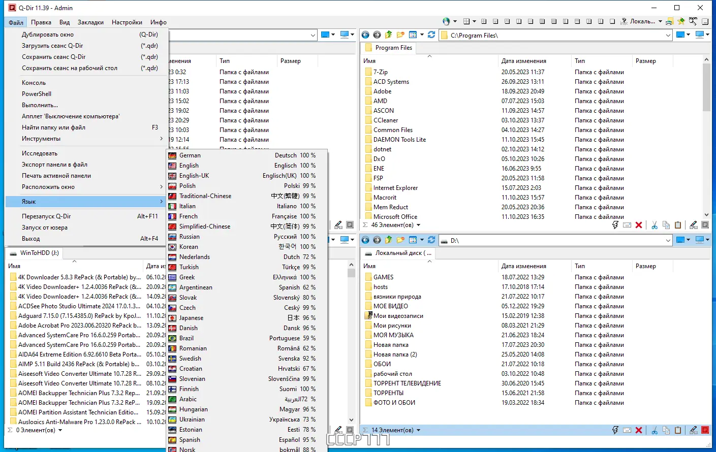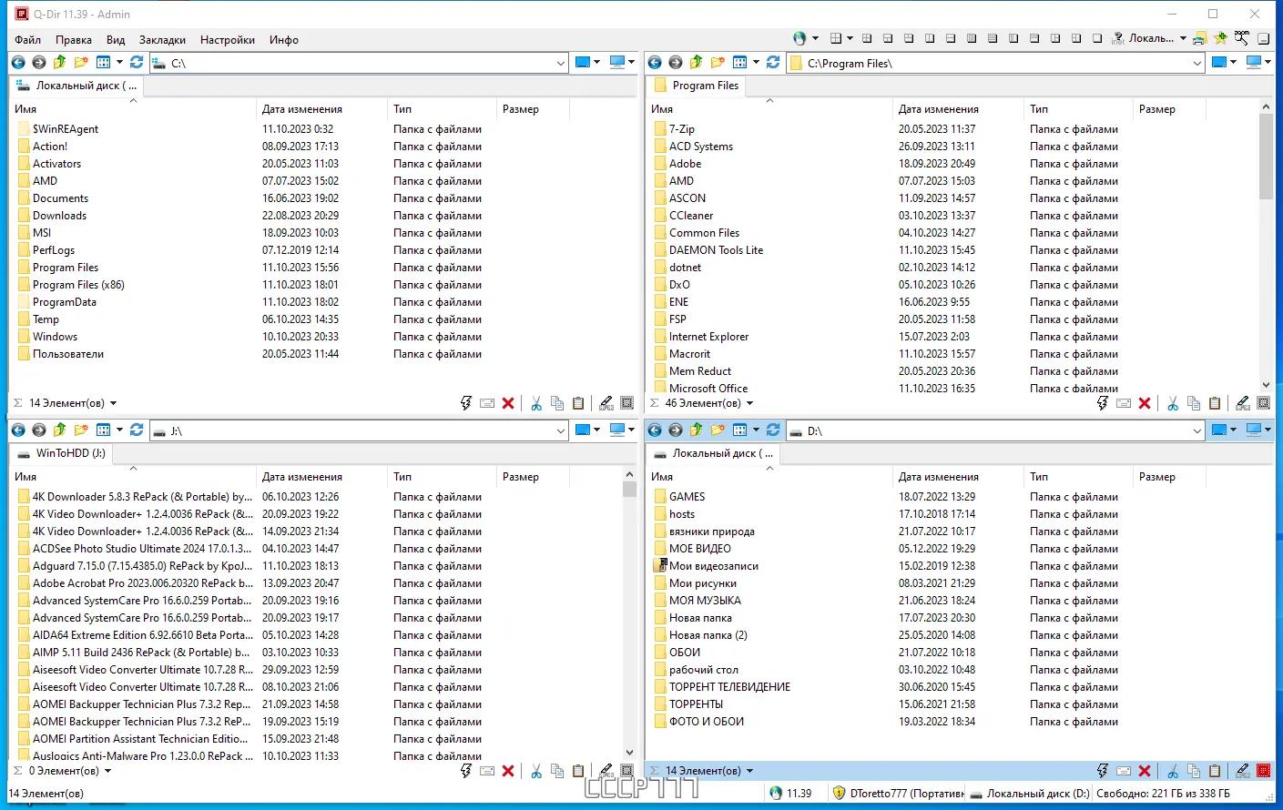 Q-Dir представляет собой высокопроизводительный файловый менеджер, разработанный для эффективной работы с файлами и папками на компьютере. Его ключевой особенностью является четырёхпанельный интерфейс, который можно настраивать под различные сценарии использования — от однопанельного режима до комбинации из двух или четырёх окон. Это существенно ускоряет процесс копирования, перемещения и сравнения содержимого разных директорий. Программа поддерживает все основные операции, включая drag & drop, буфер обмена и цветовое выделение файлов по типу.