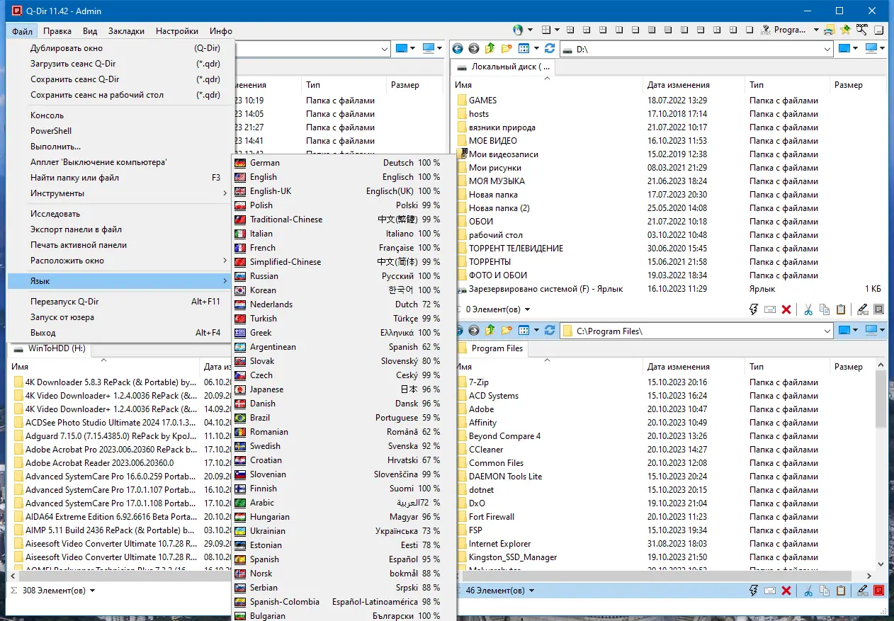 Q-Dir представляет собой компактный, но функциональный файловый менеджер, разработанный для пользователей, которым необходим быстрый доступ к различным разделам файловой системы. Его ключевой особенностью является четырёхпанельный интерфейс, который можно настраивать под индивидуальные потребности — использовать все панели одновременно или переключаться на двух- и однопанельный режим. Это значительно упрощает копирование, перемещение и сравнение содержимого папок.