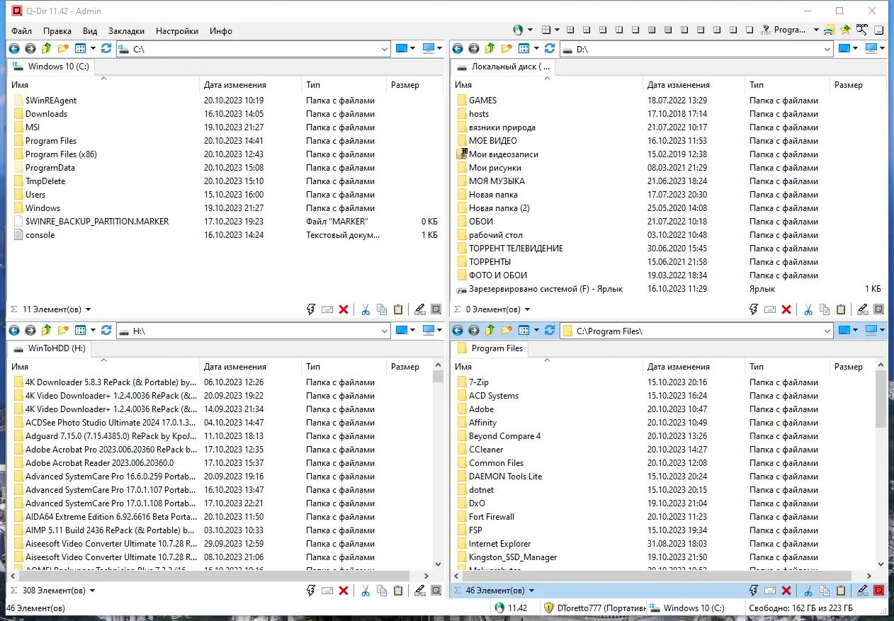 Q-Dir отличается высокой эффективностью при работе с файлами, особенно в сценариях, где требуется одновременный доступ к нескольким каталогам. Его интерфейс, несмотря на насыщенность функциями, остаётся интуитивно понятным. Программа работает быстро, не нагружая систему, и стабильно функционирует даже на старых версиях Windows. Портативная версия позволяет запускать Q-Dir с флешки без оставления следов на компьютере.