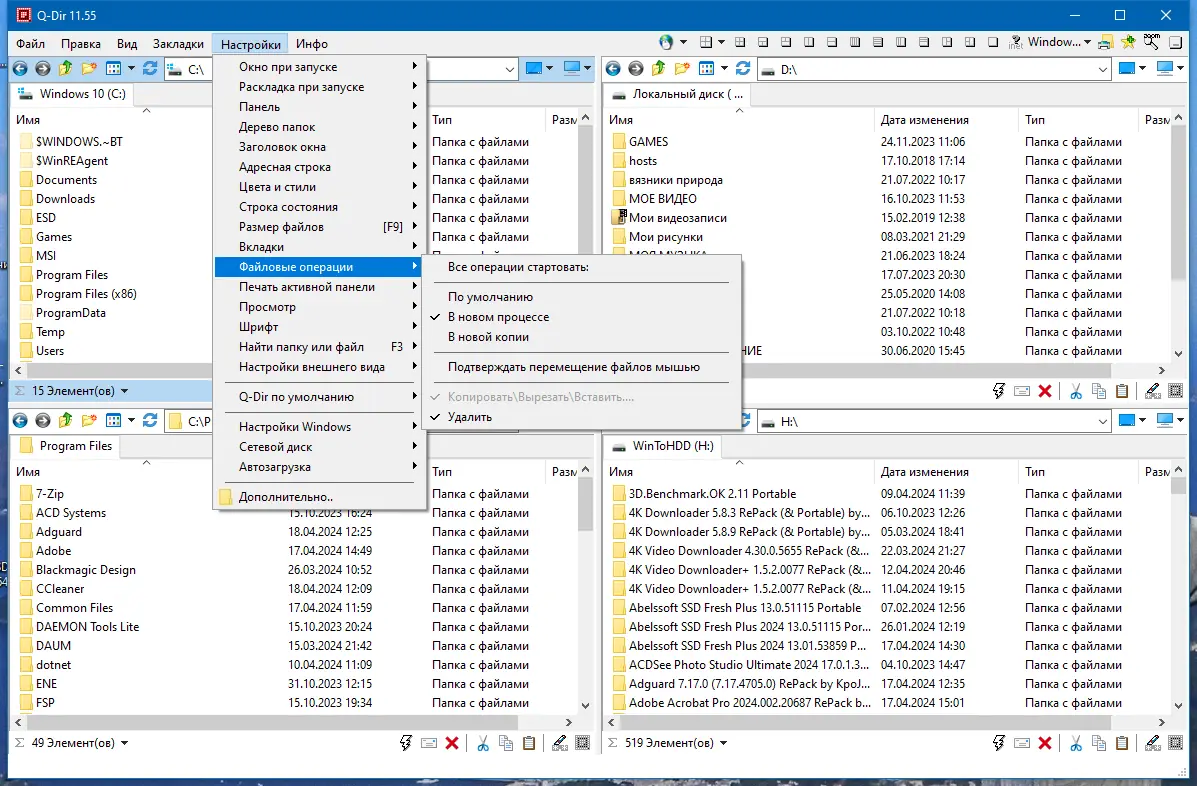 Q-Dir представляет собой файловый менеджер, разработанный для повышения эффективности работы с файловой системой. Его ключевой особенностью является четырёхпанельный интерфейс, позволяющий одновременно просматривать содержимое нескольких каталогов, что особенно удобно при копировании, сравнении и организации данных. Программа совместима с различными типами хранилищ, включая USB-устройства, сетевые папки и FTP-серверы.