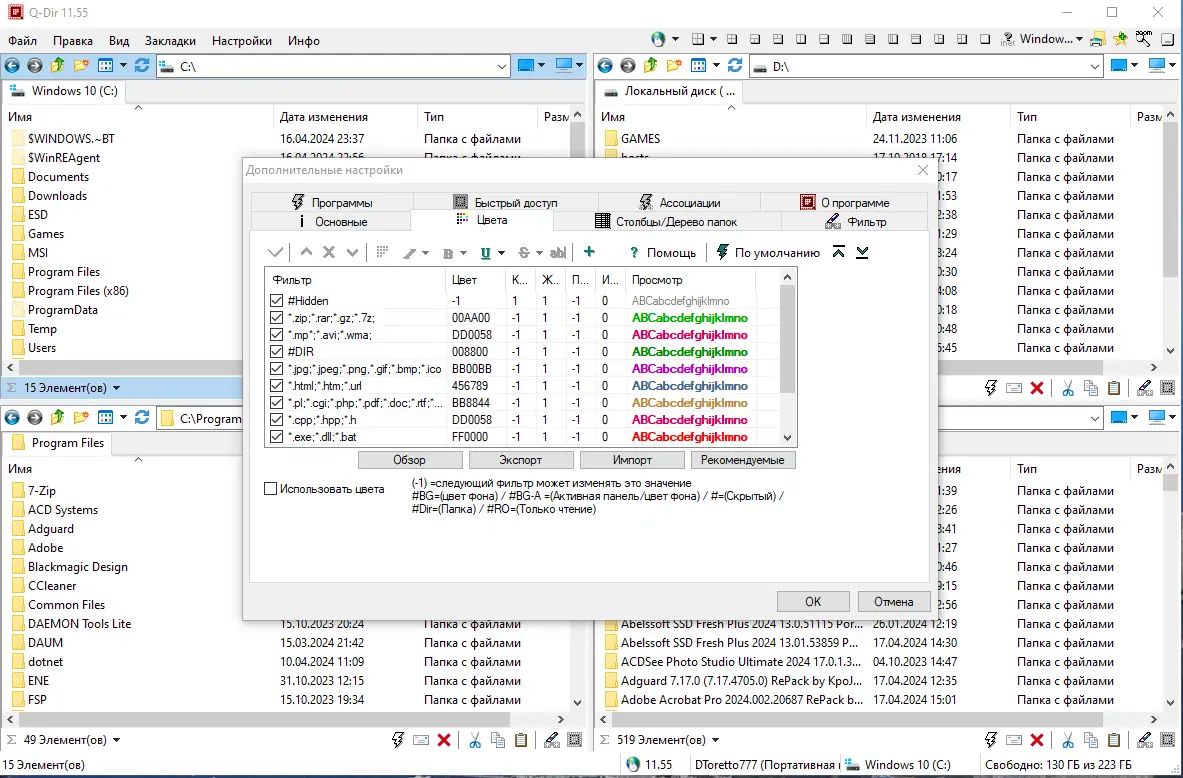 - Гибкие возможности настройки отображения, включая цветовую маркировку и фильтрацию файлов