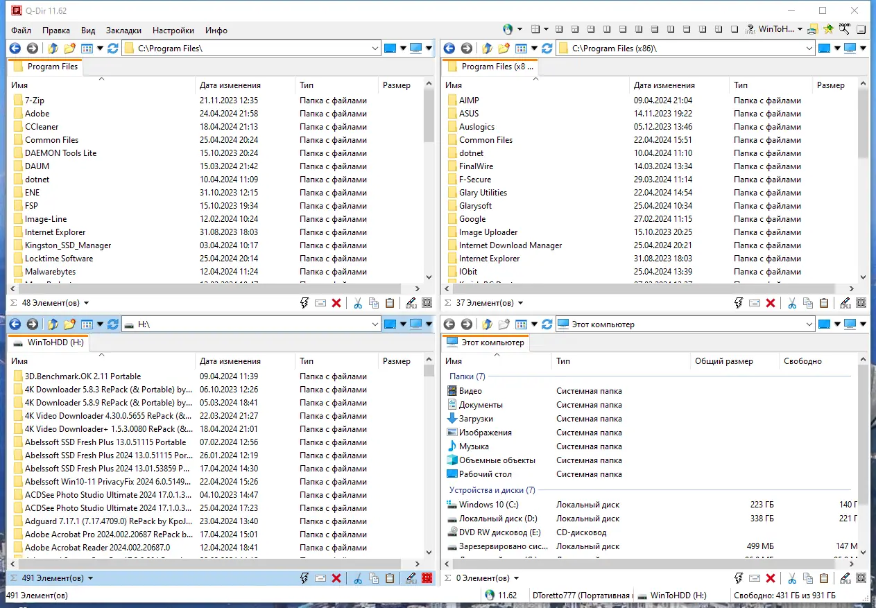 Q-Dir — это компактный и производительный файловый менеджер, разработанный для пользователей, которым необходим быстрый доступ к множеству директорий одновременно. Основная особенность программы — уникальный четырехпанельный интерфейс, позволяющий одновременно просматривать содержимое четырёх разных папок. Это особенно полезно при копировании, сравнении и организации файлов между различными носителями.