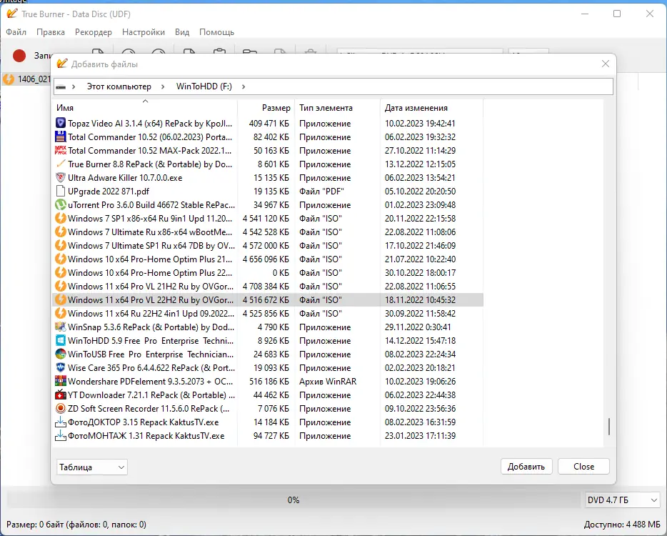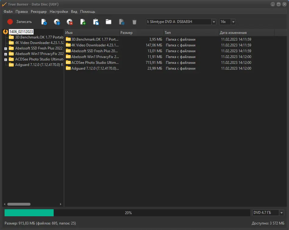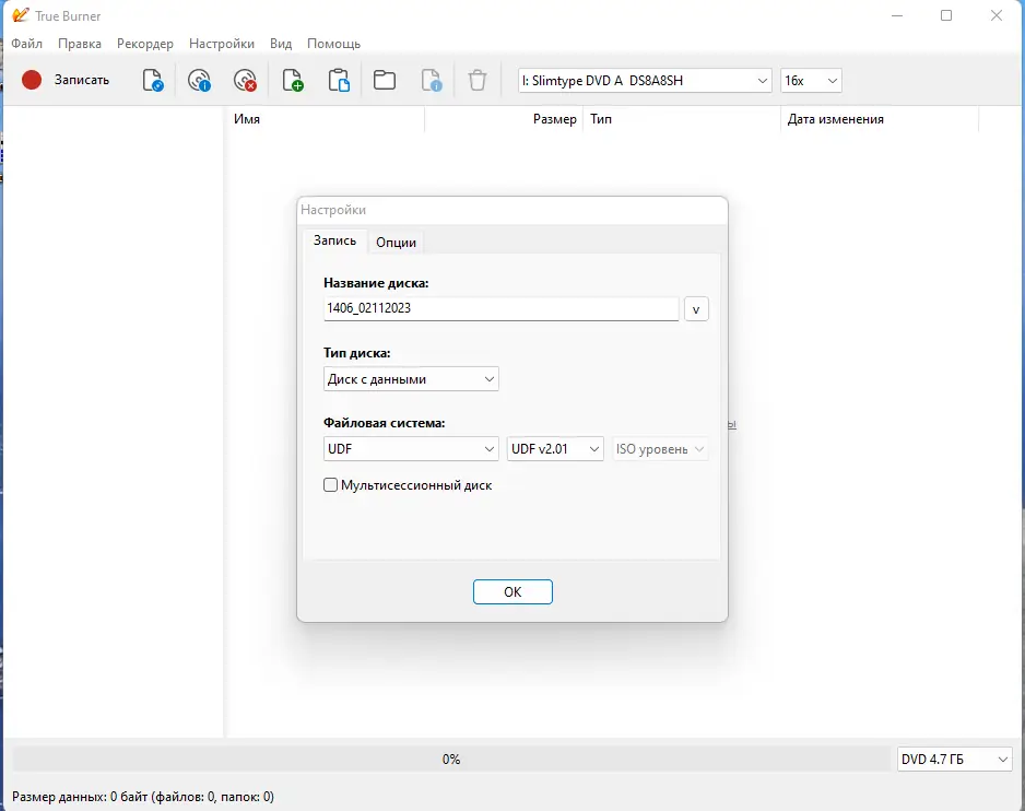 Программа True Burner предоставляет полный набор инструментов для работы с оптическими носителями. Она позволяет создавать диски с данными, записывать музыкальные композиции в формате MP3, а также генерировать DVD-Video для просмотра на бытовых проигрывателях. Поддержка файловых систем ISO 9660 и UDF обеспечивает совместимость с большинством устройств и операционных систем. Запись возможна как на одноразовые, так и на перезаписываемые диски, включая CD-R/RW, DVD-R/RW, DVD+R/RW, DVD+R DL и BD-R/RE.