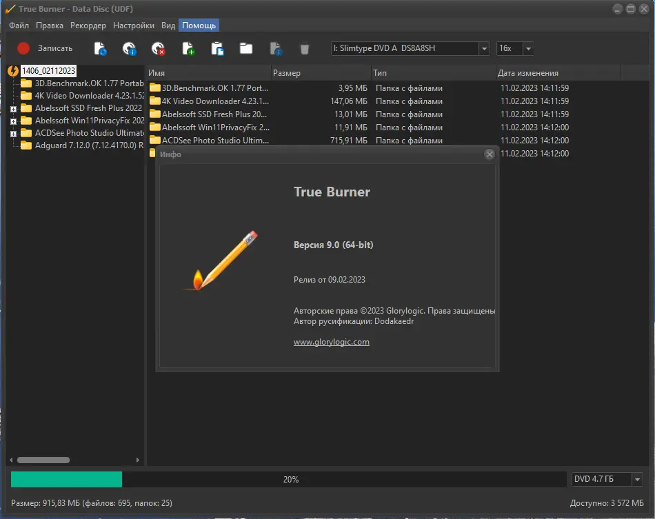 Обновлённая версия True Burner v9.0 вышла 9 февраля 2023 года и включает новый интерфейс, улучшенную работу с ISO-образами и исправление мелких утечек памяти. Программа доступна в установочной и портативной версии, поддерживает русский и английский языки. Распространяется бесплатно, не требует активации. Подходит для систем Windows 7, 8.1, 10 и 11 разрядностью x32 и x64. Конфигурация сохраняется через файл trueburner.ini, что удобно при использовании на разных устройствах.
