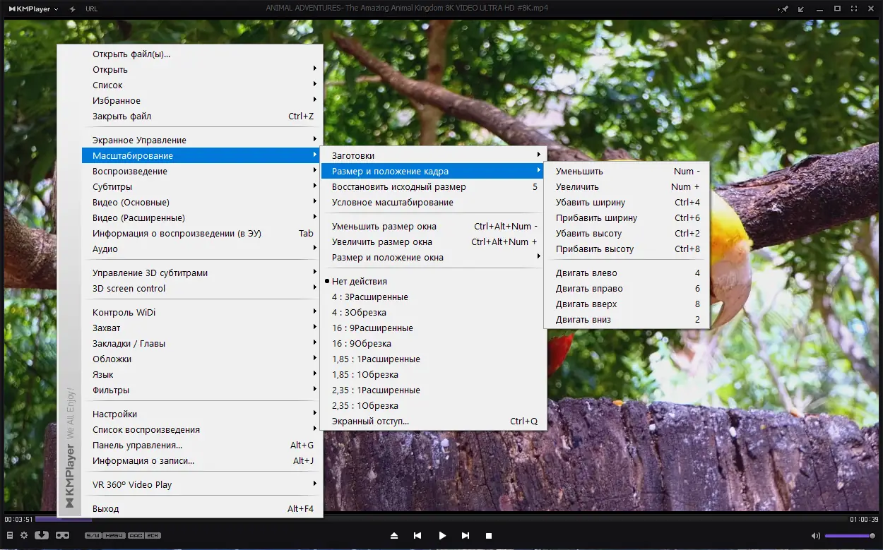 Пользоваться плеером просто: после запуска достаточно перетащить нужный файл в окно приложения или открыть его через меню «Файл». Программа автоматически распознаёт формат и запускает воспроизведение. Управление осуществляется как через интерфейс, так и с помощью горячих клавиш, которые можно настроить под себя. Встроенное меню позволяет включить субтитры, выбрать аудиодорожку, изменить соотношение сторон, активировать полноэкранный режим и настроить цветокоррекцию. Также доступна функция захвата кадров и записи аудио с выхода. Пользователи могут создавать плейлисты, которые сохраняются между сеансами, а при следующем запуске воспроизведение продолжится с места остановки.