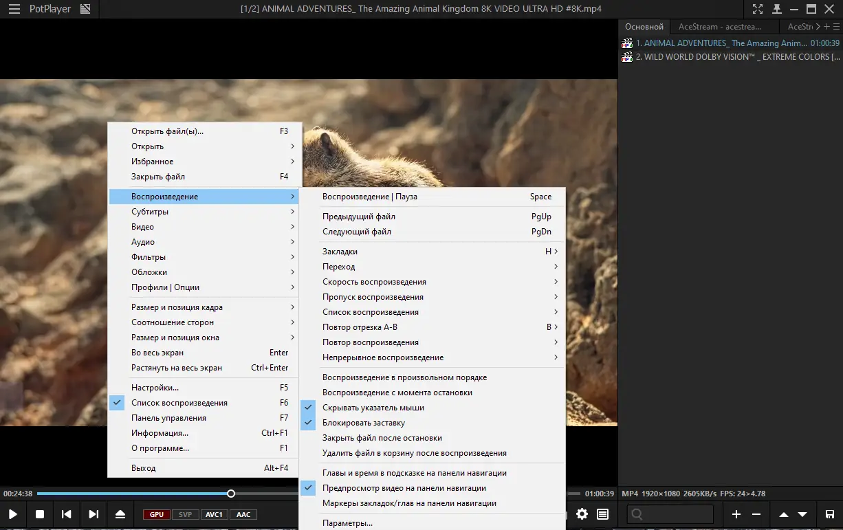 Использование PotPlayer не требует глубоких технических знаний. После запуска программа автоматически распознаёт большинство файлов, позволяя сразу начать воспроизведение. Управление осуществляется как через стандартные элементы интерфейса, так и с помощью горячих клавиш, которые можно настраивать под себя. Поддерживается изменение скорости воспроизведения, масштабирование видео, наложение шейдеров и применение фильтров. Для просмотра контента с торрентов доступна интеграция с TorrServeW и Ace Stream Engine. Также можно настроить автоматическое выключение компьютера по завершении воспроизведения, что удобно при просмотре длинных видео.