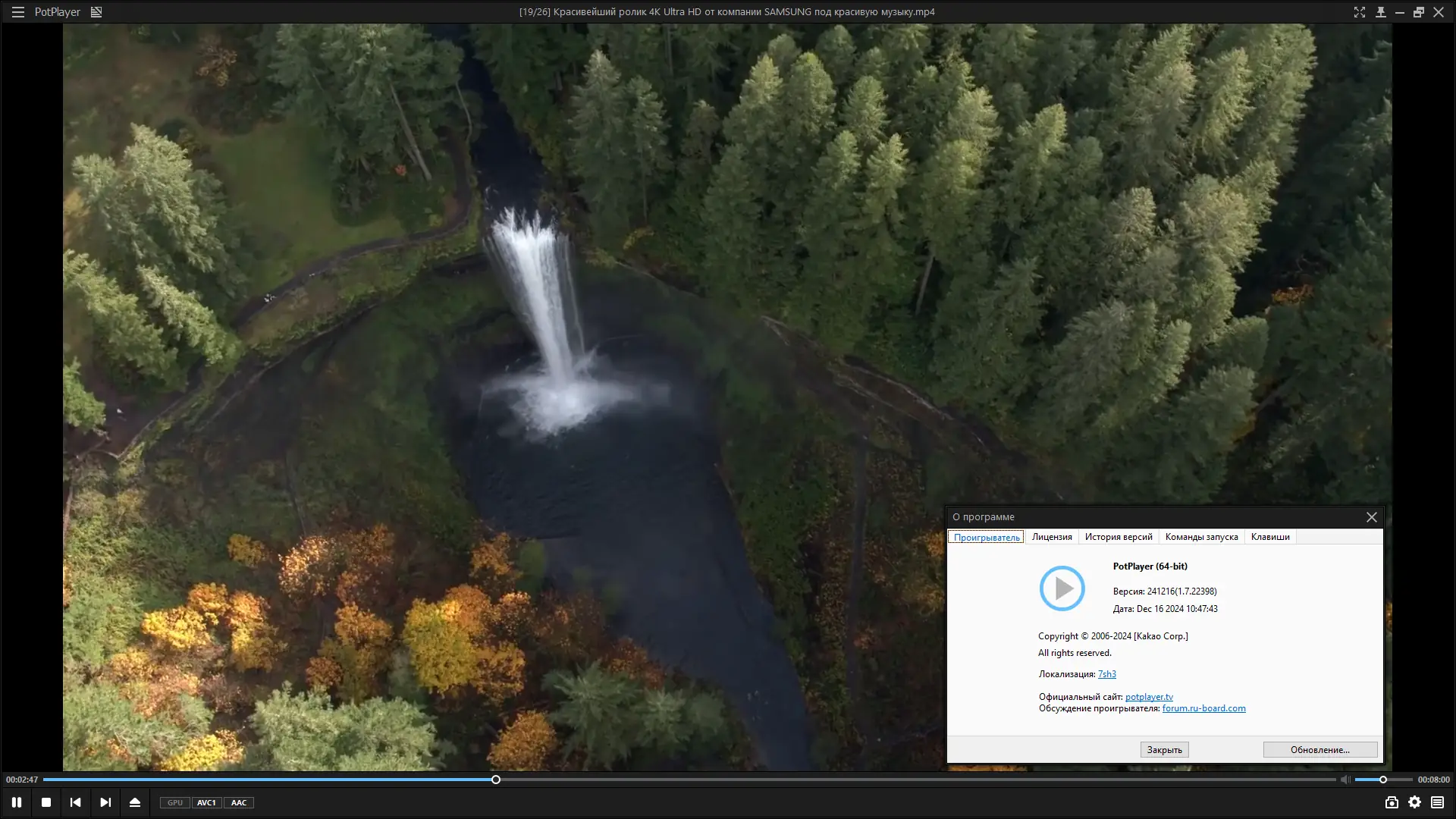 PotPlayer — это современный проигрыватель, сочетающий в себе высокую производительность, минимальное потребление системных ресурсов и широкие возможности для кастомизации. Программа поддерживает воспроизведение практически всех существующих аудио- и видеоформатов, включая MKV, AVI, MP4, FLV, WMV, MOV, 3GP, а также аудио в форматах MP3, FLAC, WAV, AAC и многих других. Встроенные кодеки DXVA обеспечивают аппаратное ускорение, что особенно важно при работе с контентом высокого разрешения, включая 4K и HDR. Пользователи могут настраивать цветопередачу, контрастность, яркость и другие параметры изображения, добиваясь максимального визуального комфорта.