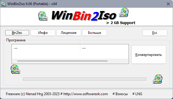 WinBin2Iso — это компактная утилита для преобразования образов дисков из формата BIN в ISO. Программа не требует установки и быстро справляется с конвертацией, включая файлы размером более 2 ГБ.
