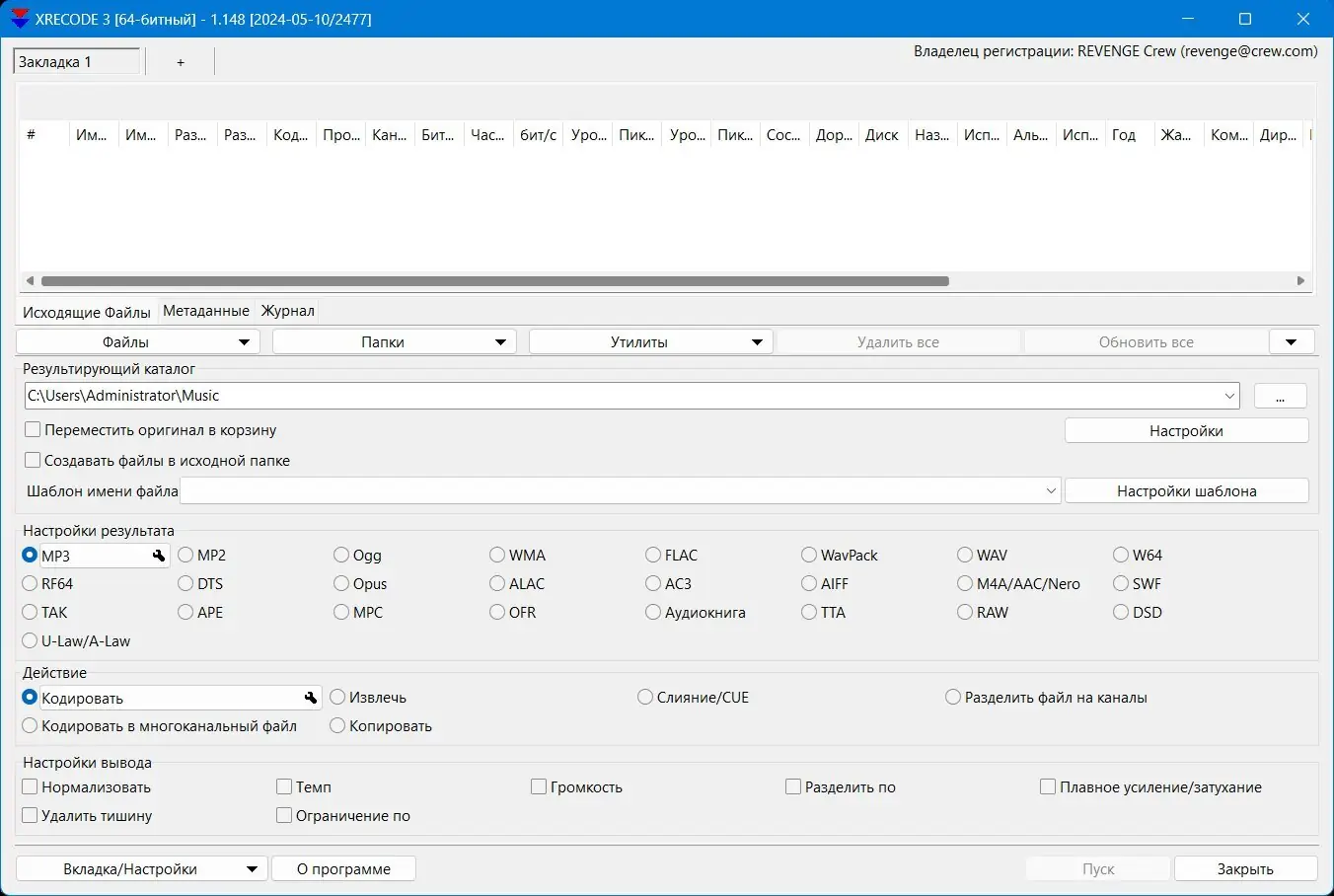 Xrecode — это современный аудио конвертер, разработанный для быстрого и качественного преобразования звуковых файлов между различными форматами. Он сочетает в себе высокую производительность, поддержку многопоточности и удобный drag-and-drop интерфейс, что значительно упрощает работу с большими объёмами данных. Программа поддерживает как популярные, так и редкие аудиоформаты, включая FLAC, WavPack, APE, TAK, а также позволяет извлекать аудиодорожки из видеофайлов форматов AVI, MKV, FLV и других. Особое внимание уделено качеству конвертации — реализована поддержка 24/32-битных файлов и точных настроек битрейта. Пользователи могут одновременно конвертировать один исходник в несколько форматов, что удобно при создании копий для разных устройств.