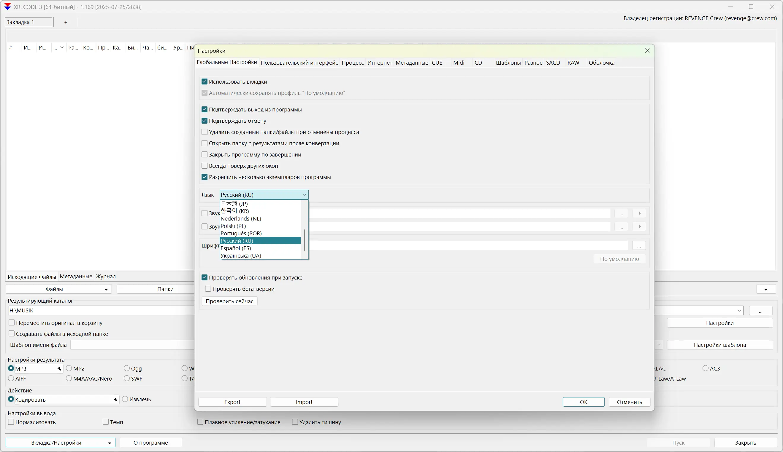 Интерфейс XRecode построен на принципе drag and drop, что делает его простым и удобным даже для новичков. Достаточно перетащить нужные файлы в окно программы, выбрать целевой формат и начать конвертацию. Пользователь может одновременно преобразовать один исходный файл в несколько форматов, используя опцию «Несколько». Поддержка CUE-файлов позволяет точно разделять аудиоархивы на треки, а встроенный инструмент для граббинга аудио-CD обеспечивает качественное извлечение звука с физических носителей. Работа с метаданными осуществляется через встроенный редактор, где можно изменять названия, исполнителей, альбомы и добавлять изображения обложек. Программа также поддерживает импорт и экспорт тегов в отдельные файлы, что удобно при массовой обработке.