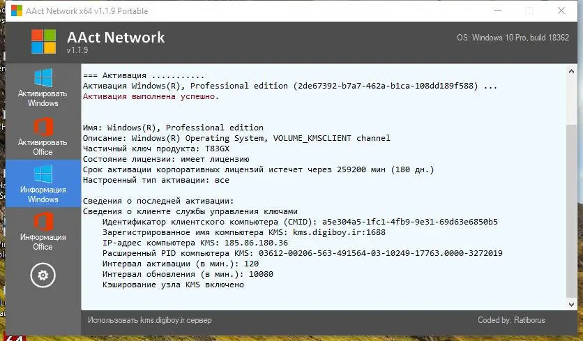 AAct Network — это компактный и функциональный KMS-активатор, разработанный для работы с объемными лицензионными редакциями Windows и Office. В отличие от аналогичных инструментов, он не использует промежуточные файлы и не зависит от .NET Framework, что делает его особенно эффективным на устаревших системах. Приложение поддерживает как ручной, так и автоматизированный режим работы, включая скрытую активацию через командные ключи.