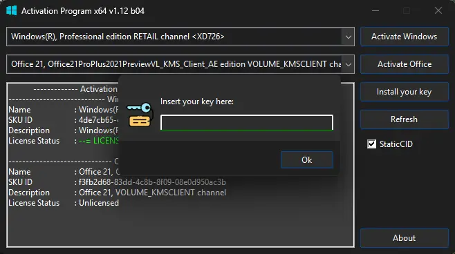 Интерфейс утилиты прост и не требует специальных знаний. Пользователь выбирает нужную лицензию из списка, после чего программа автоматически определяет подходящий метод активации. Для лицензий, поддерживающих бессрочную активацию, применяется метод ZeroCID. В случае с KMSCLIENT — используется KMS4k, дающий срок более 4000 лет. Дополнительно доступны командные параметры, позволяющие точно управлять процессом. Например, можно установить ключ через /ipk или принудительно применить AVMA4k для серверных редакций. Отключение интернета перед активацией помогает избежать конфликтов с KMS-сервером и обеспечивает максимальный срок действия.