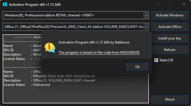 Интерфейс Activation Program интуитивно понятен и не требует глубоких технических знаний. Пользователю необходимо запустить приложение с правами администратора, после чего выбрать нужную лицензию из списка доступных. Программа автоматически определит подходящий метод активации в зависимости от типа лицензии и версии операционной системы. Для редакций с пометкой VOLUME_KMSCLIENT будет применён метод kms4k, а для телефонной активации — ZeroCID. При необходимости можно использовать командную строку для точного управления процессом, например, для установки ключа или сброса таймера оценки.