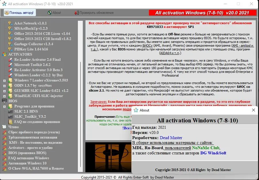 Сборник активаторов доступен для использования в 2021 году и включает в себя обновлённые версии всех ключевых утилит. Пользователи, ищущие, где скачать бесплатные виндовс или бесплатные windows торрент, найдут в этом наборе всё необходимое для полной настройки системы. Решение подходит как для домашнего, так и для офисного использования. Среди представленных инструментов можно найти программы для любых задач — от простой активации до сложной модификации BIOS. Какие именно методы использовать — зависит от уровня подготовки и требований к стабильности. Также в сборке есть утилиты для сброса пробного периода и управления лицензиями. Шампуни здесь, конечно, ни при чём, но всё остальное — под рукой. Программа позволяет быстро и надёжно активировать систему, не прибегая к сомнительным сайтам. Скачать 7 версий Windows или более новые редакции с полной активацией стало проще, чем когда-либо.