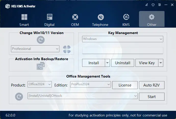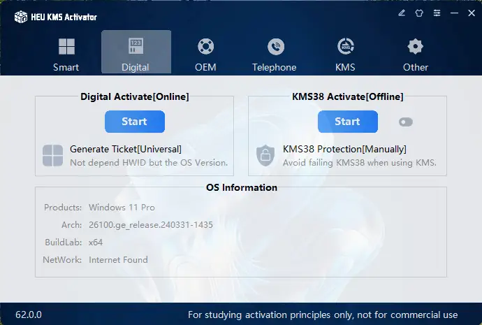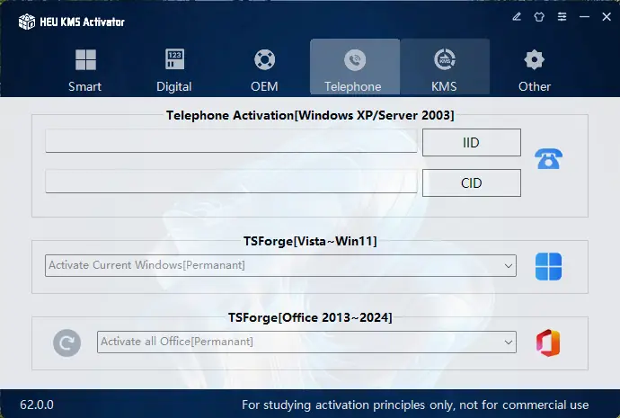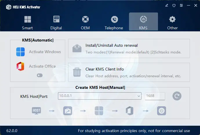 HEU KMS Activator — это инструмент для локальной активации операционной системы Windows и пакета Microsoft Office. Программа поддерживает широкий спектр версий, включая Windows XP, 7, 8.1, 10, 11 и офисные приложения начиная с 2010 года вплоть до Office 2024 и Office 365. Процесс активации осуществляется в один клик с возможностью выбора метода — цифровая лицензия, KMS38, OEM или классический KMS.