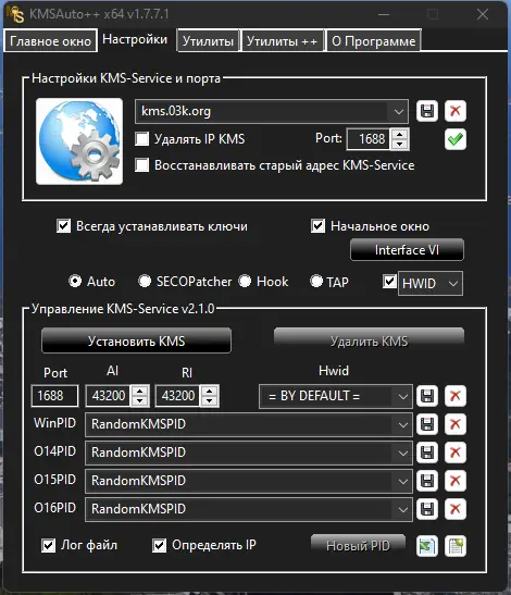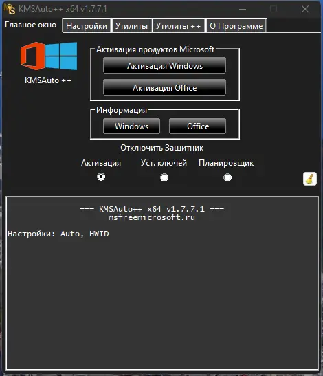 - Поддерживает активацию Windows и Office через эмуляцию KMS-сервера на локальной машине.