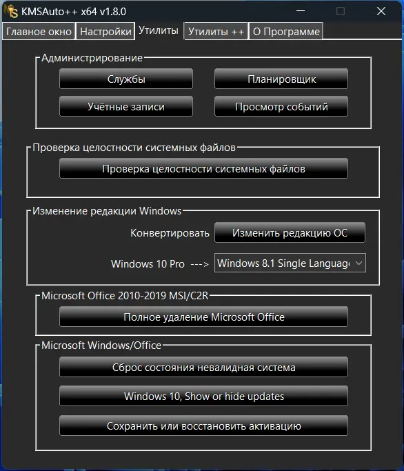 KMSAuto++ — это универсальный инструмент для автоматической активации лицензионных версий операционных систем Windows и пакета Microsoft Office. Программа поддерживает широкий спектр продуктов, включая Windows 10, 8.1, 7, серверные редакции, а также офисные пакеты 2010–2019 годов. Она работает на базе KMS-технологии и не требует сложных настроек для запуска процесса активации.