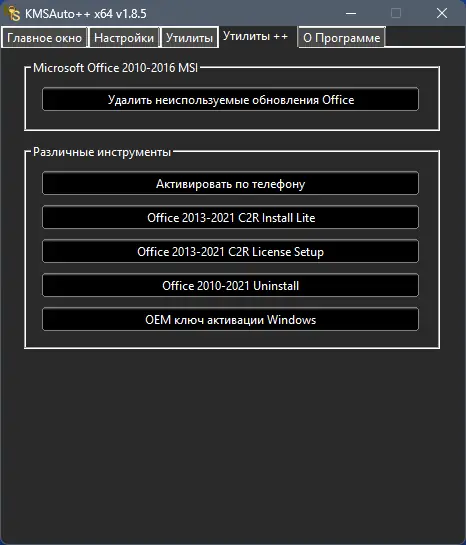 KMSAuto++ — это компактный и функциональный инструмент для автоматической активации операционных систем Windows корпоративных версий и офисных пакетов Microsoft Office. Программа поддерживает широкий диапазон продуктов, включая Windows с Vista по 11 и Office с 2010 по 2019 год, обеспечивая стабильную работу без необходимости в интернет-соединении после настройки.