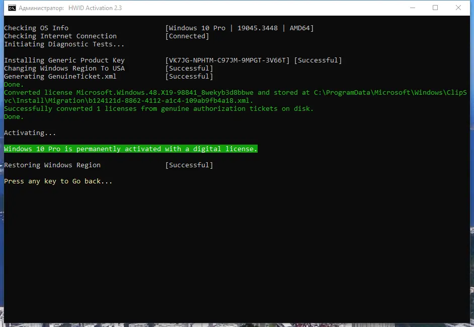 - Поддерживает активацию через HWID — метод, при котором система привязывается к аппаратному идентификатору устройства.