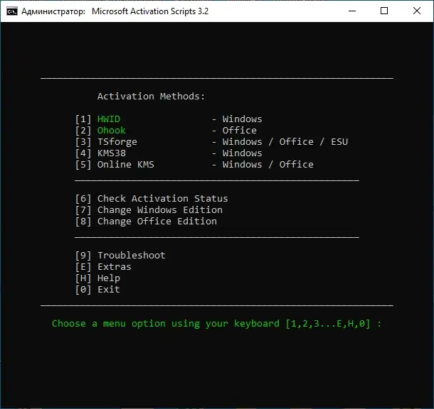 - Поддержка нескольких методов активации: HWID, Ohook, KMS38, OnlineKMS, TSforge