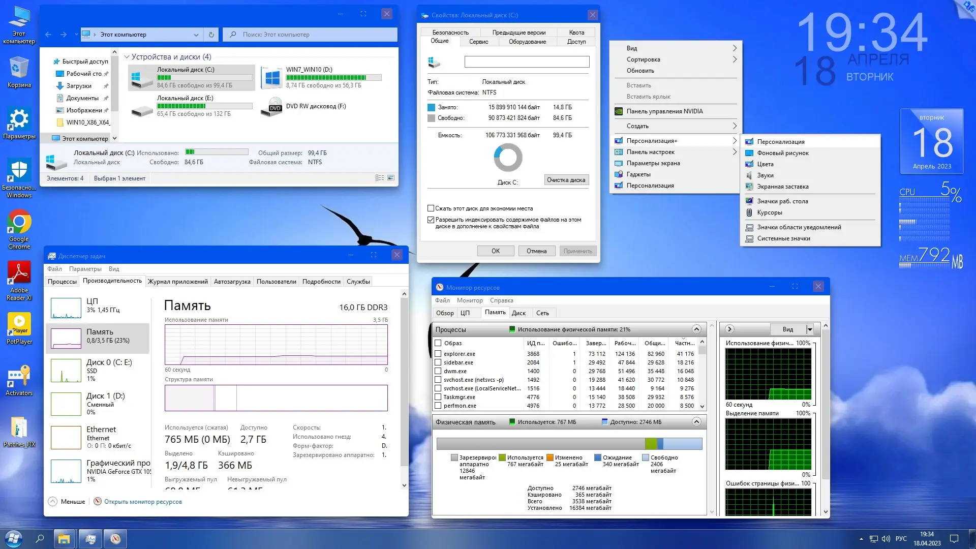 После установки система готова к работе. Рекомендуется сразу перезагрузить компьютер для корректного применения всех настроек. Пользователь может настроить внешний вид с помощью встроенного меню «Персонализация+», установить нужную тему, фон рабочего стола и активировать гаджеты. Меню «Пуск» уже заменено на классическое с помощью StartIsBack++, но его можно настроить или отключить. Для просмотра PDF используется Adobe Reader XI, для архивов — WinRAR, а веб-серфинг доступен через Google Chrome и Microsoft Edge. Все установленные программы можно удалить через «Панель управления», если они не требуются. Для активации системы предусмотрен встроенный KMS-активатор, который запускается автоматически или вручную из папки Activators.