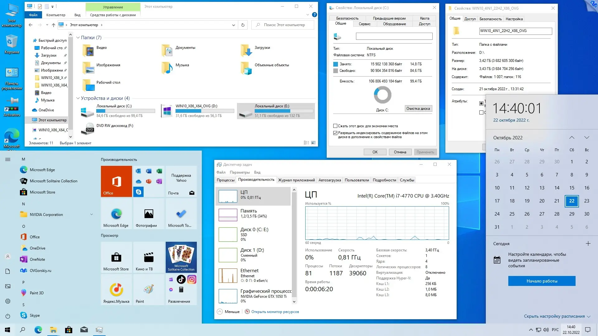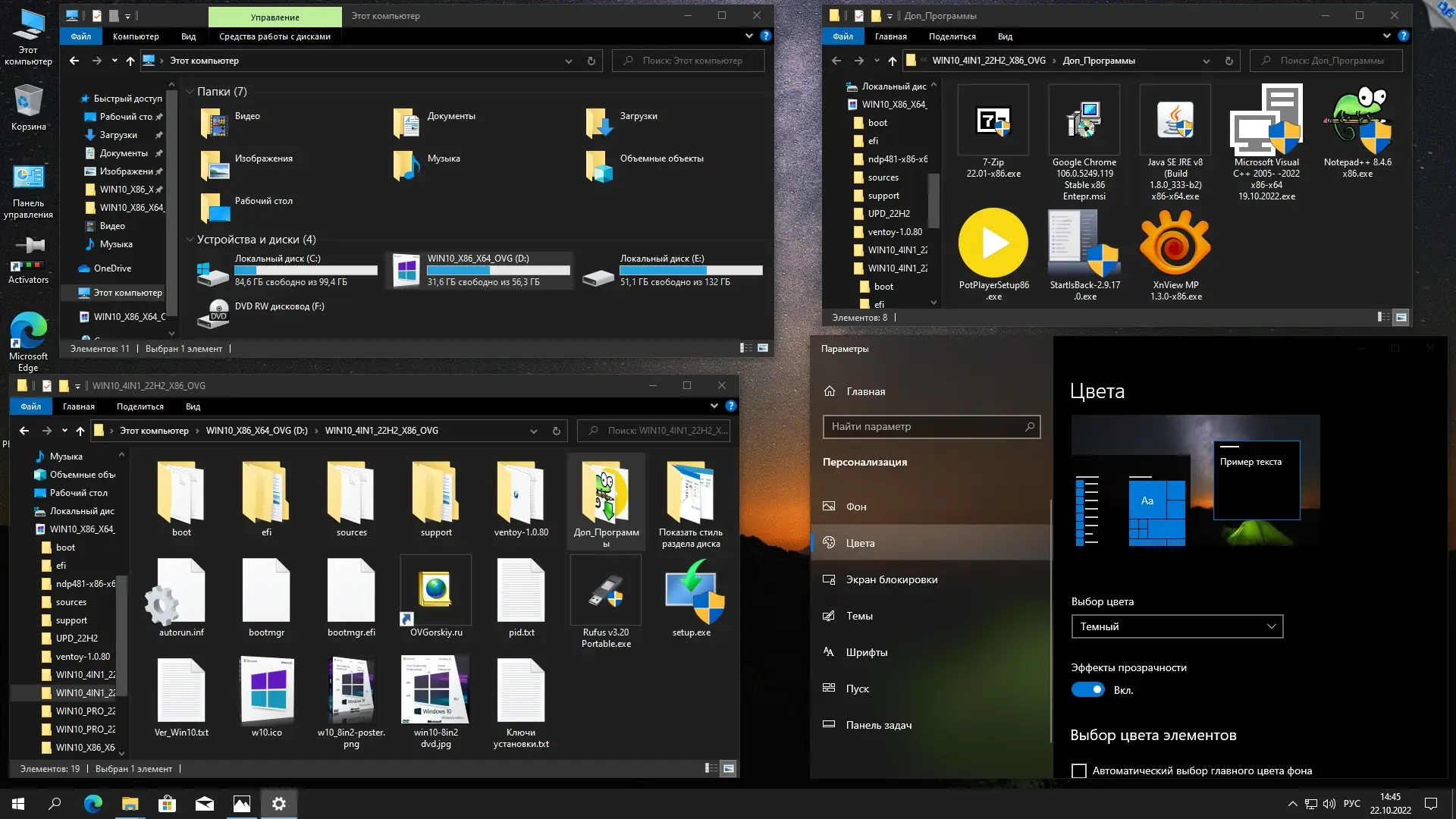 Обновлённые оригинальные русские образы Windows 10 версии 22H2 от Microsoft, объединённые в два универсальных ISO-файла (x86 и x64), включают в себя интегрированные накопительные обновления по октябрь 2022 года, набор инструментов восстановления DaRT10 и служебные утилиты. Сборка основана на официальных образах MSDN и предназначена для пользователей, которым нужна чистая, стабильная и функциональная система без лишних модификаций. Установка поддерживается на дисках с MBR и GPT, включает поддержку UEFI и совместима с современным и устаревшим оборудованием.
